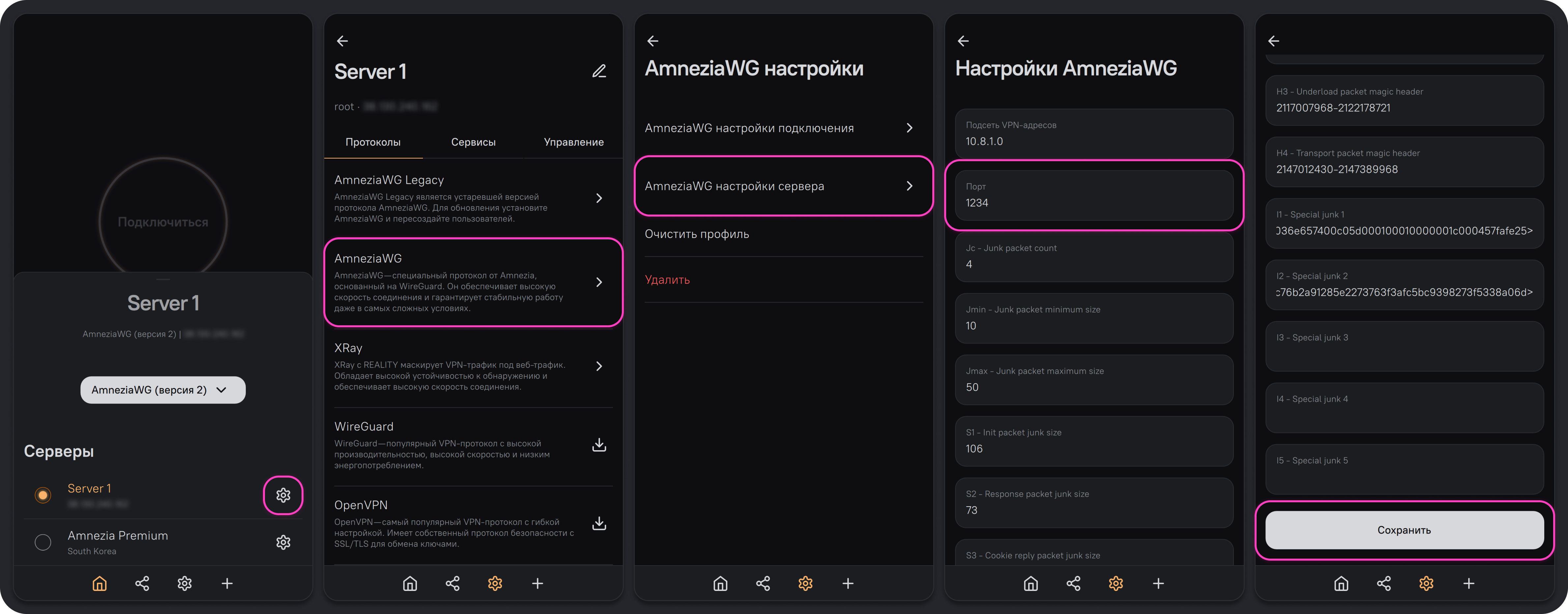 Подготовленную строку нужно использовать для изменения параметров I1-I5 в настройках либо сервера, либо клиента, в зависимости от используемой версии протокола AmneziaWG.