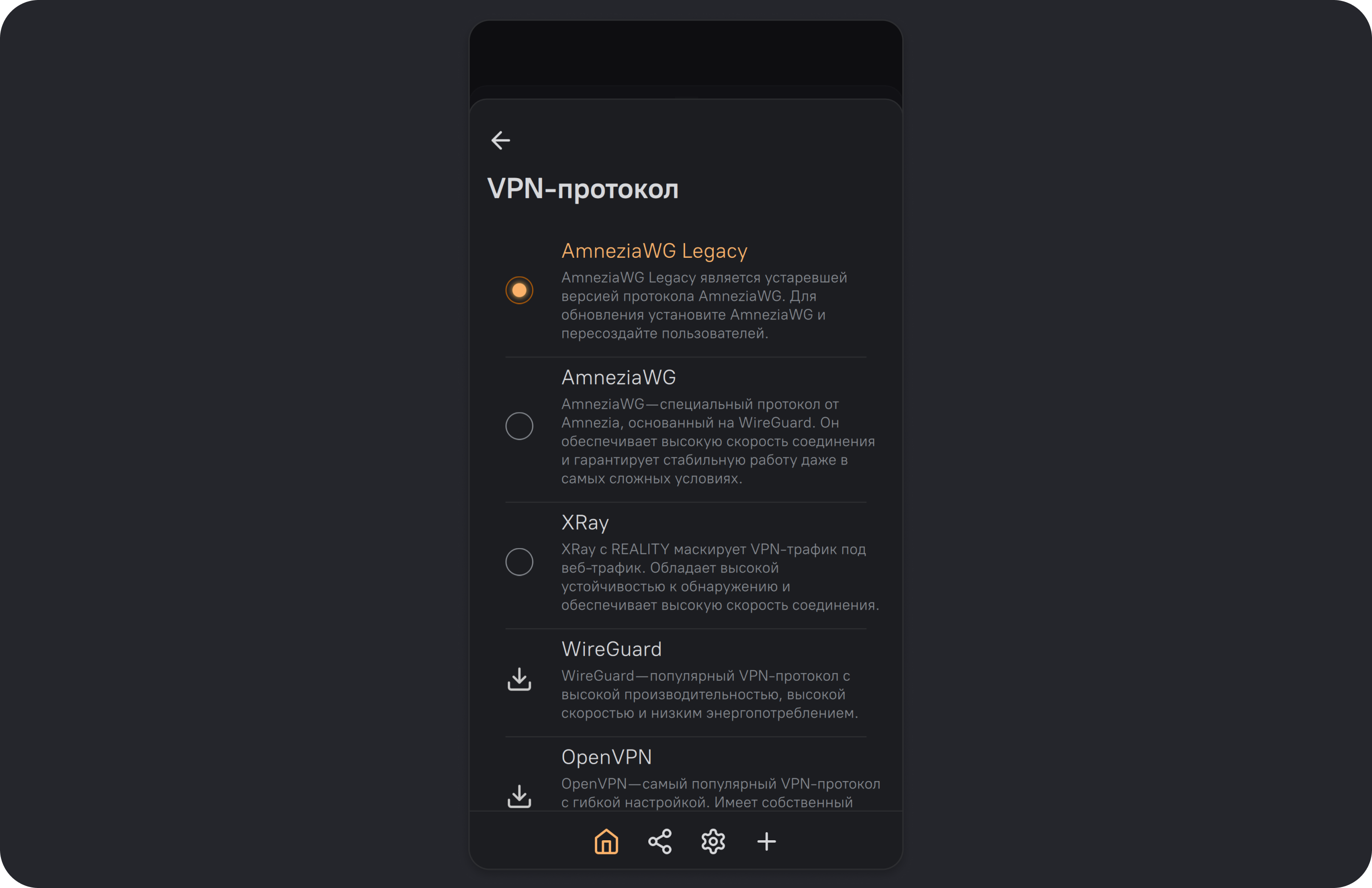 После завершения установки протокол AmneziaWG 2.0 станет доступным для выбора в параметрах подключения — можно сразу п одключаться к VPN и делиться доступом по новому протоколу.