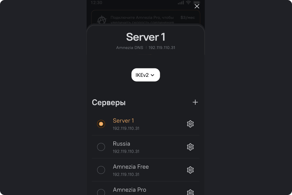 Откройте приложение Amnezia. На главном экране внизу кликните на название вашего сервера.