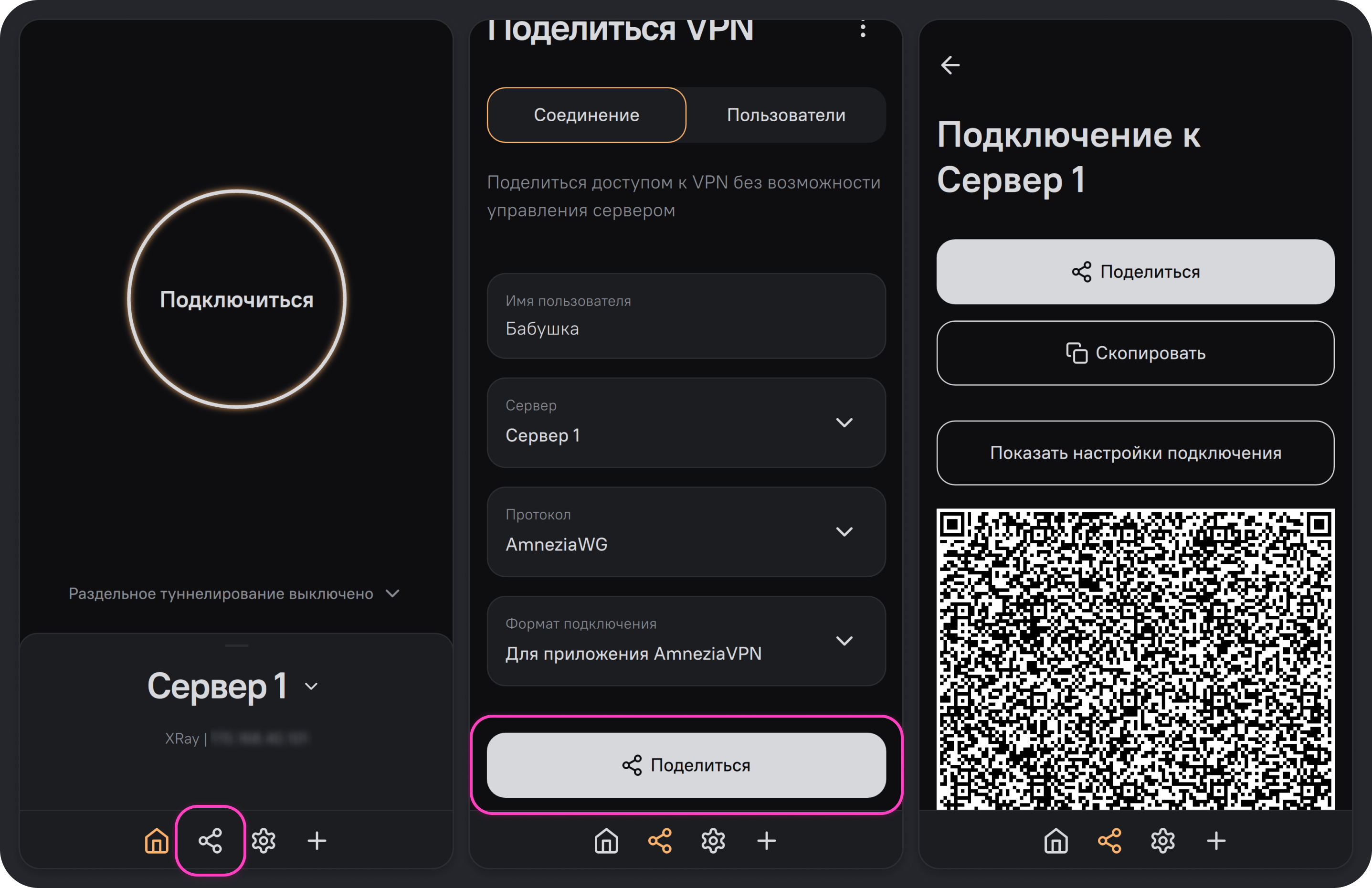 1. Откройте приложение AmneziaVPN, в котором есть созданное подключение к серверу с полным доступом, и нажмите на иконку Поделиться — она находится на нижней панели слева от шестерёнки.