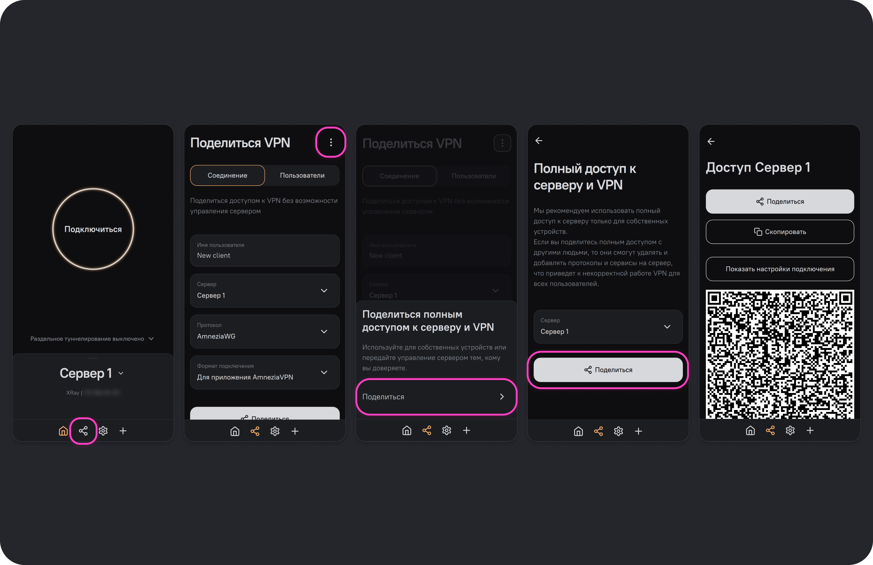 Если вы настроили на сервере VPN с помощью приложения AmneziaVPN, поделиться можно полным или гостевым доступом к VPN, которые имеют между собой крайне важные отличия. В приложении AmneziaVPN эти опции называются Поделиться полным доступом к серверу и VPN и Поделиться VPN — далее в этой инструкции мы будем называть их просто полным и гостевым доступом.