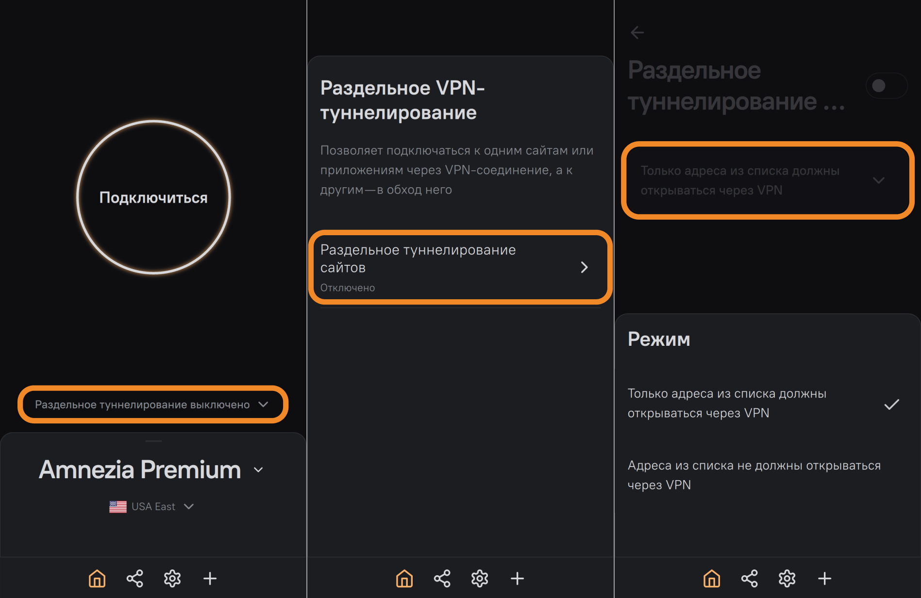 В подключении Amnezia раздельное туннелирование по IP-адресам недоступно.