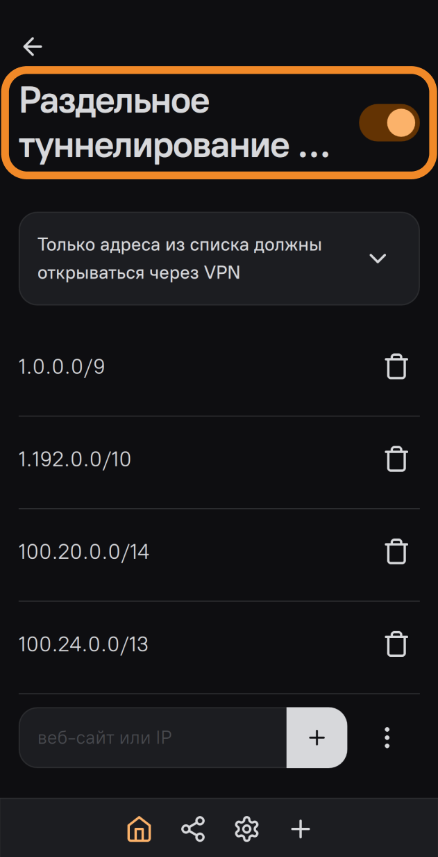 - Android — раздельное туннелирование можно настроить и по IP-адресам, и по приложениям, для каждого варианта доступны два режима: выбранные IP-адреса/приложения будут работать через VPN и ли без VPN.