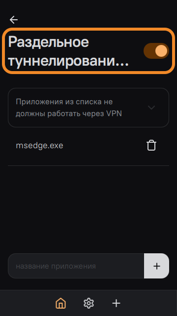 - Зайдите в параметры раздельного туннелирования приложений и нажмите кнопку ➕ (плюс).