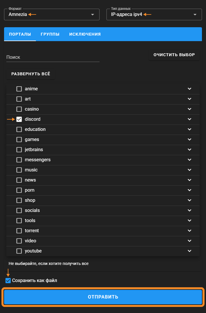 - Перейдите на сайт https://iplist.opencck.org/ru → выберите формат Amnezia и тип данных IP-адреса IPv4.