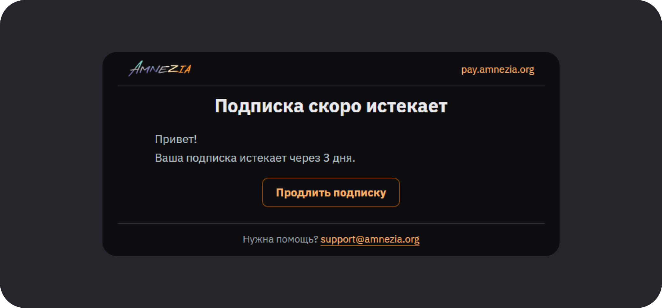 Вариант 1. Когда до окончания срока Amnezia VPN останется 3 дня, на вашу почту, указанную при оплате, придёт письмо с уведомлением об истечении подписки — в этом письме будет кнопка Продлить подписку. Нажмите её, выберите срок действия и метод оплаты, после чего оплатите продление Amnezia VPN.
