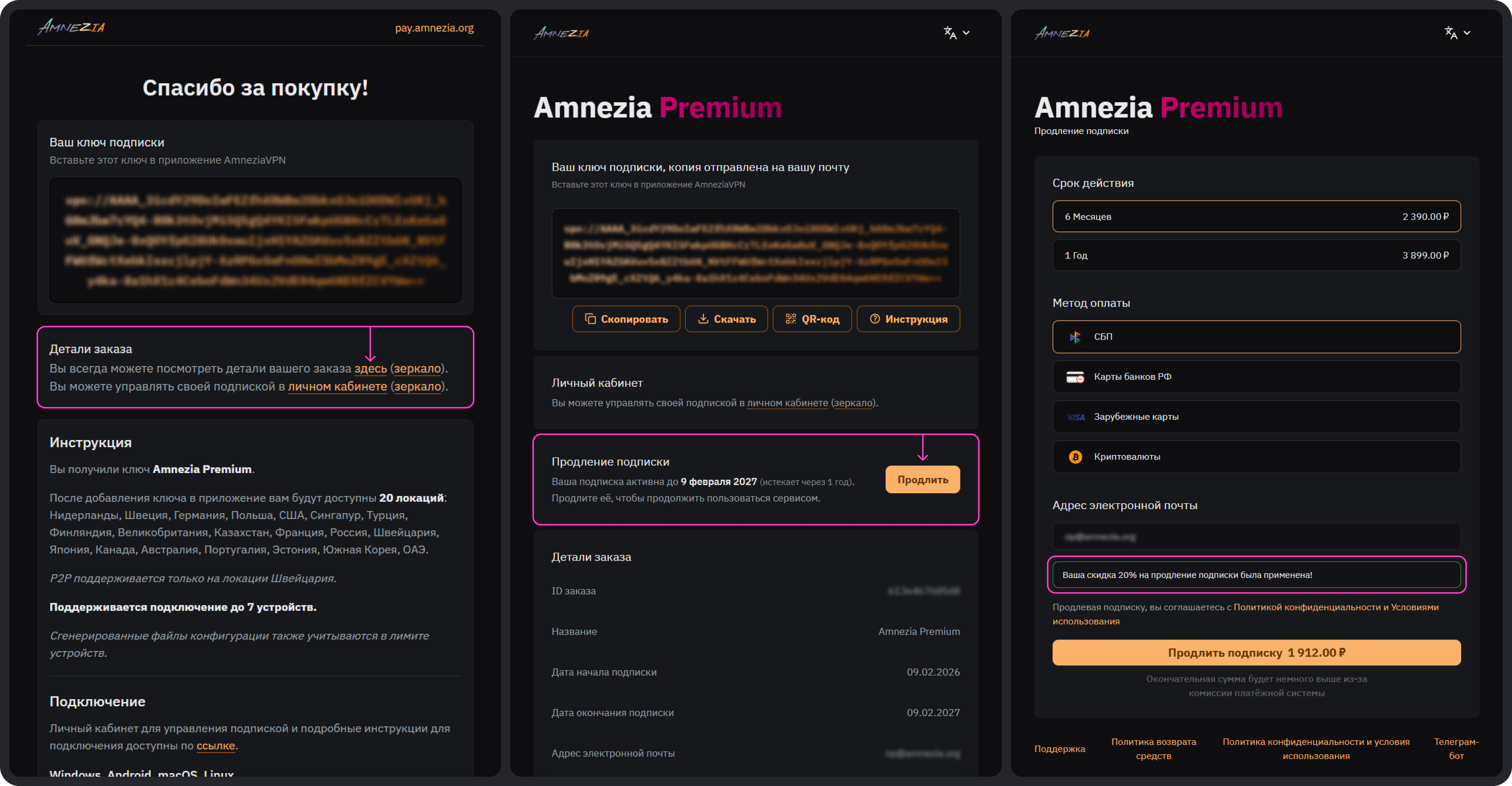 Вариант 3. Если вы оплатили Amnezia VPN 7 февраля 2026 или позже, в полученном письме с ключом подписки есть ссылка на страницу с деталями заказа — перейдите по ней.